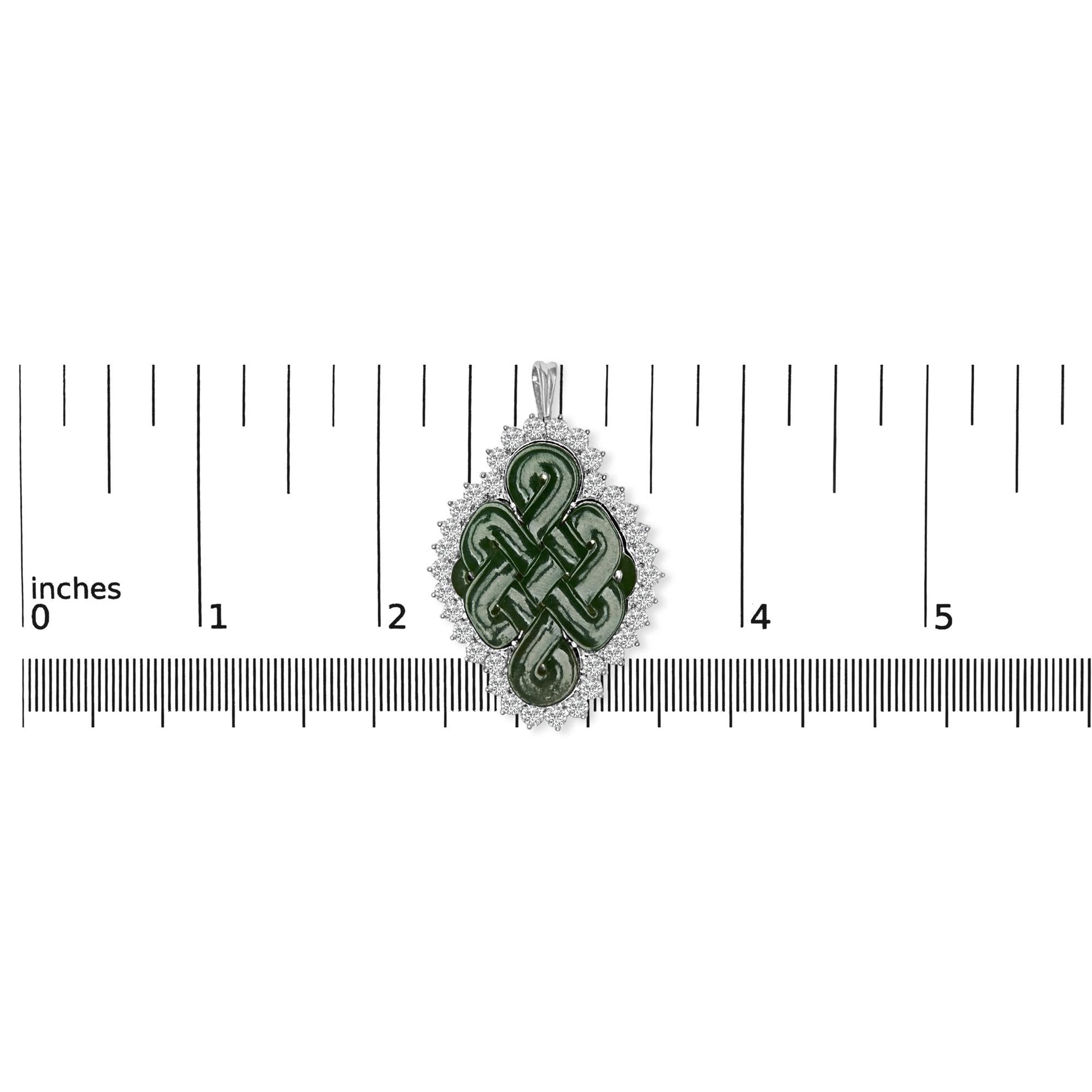 In an epoch where elegance intertwines with versatility, this masterfully crafted 18K white gold brooch and pendant emerges as a paragon of sophistication. Adorned with a natural, intricately carved jade shield that whispers tales of antiquity and allure, this piece captivates and charms at first glance. Encircling this mesmerizing centerpiece are glittering, round brilliant-cut diamonds totaling 2.00 carats, each of G-H color and VS1-VS2 clarity, their radiance echoing the stars. Finished with a rhodium plating, the brooch gleams with an ethereal luster, promising not only a magnificent sheen but enduring strength. Whether adorned as a brooch or dangled as a pendant, it extends about 2 inches, transforming any ensemble into a statement of unparalleled prestige and beauty.
