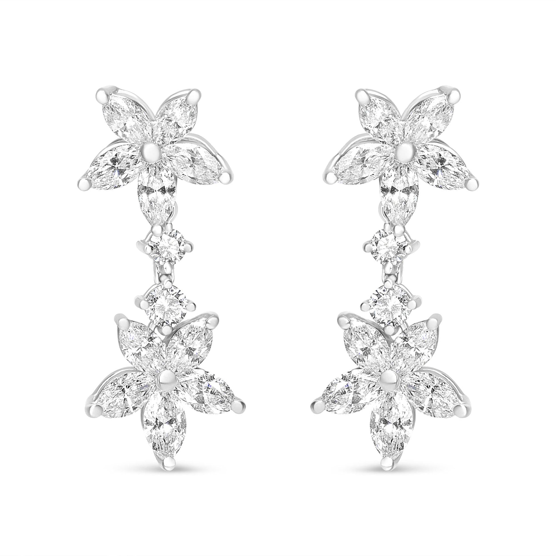 These enchanting marquise diamond floral dangle drop earrings are elegantly feminine, crafted in a design inspired by Mother Nature's artful handiwork. Sparkling, prong-set marquise diamonds form the basis of each blooming flower to become the very epitome of luxury and sophistication. Each earring boasts two flower silhouettes, adjoined by two prong-set round diamonds in a design styled for drama with a 1 1/3 inch length. These lustrous diamonds arte of a total 6 cttw and are of an approximate E-F color and VS1-VS2 clarity. The push back findings keep these pierced earrings safe and secure on your ears for comfortable wear for all of your favorite ensembles and special occasions.